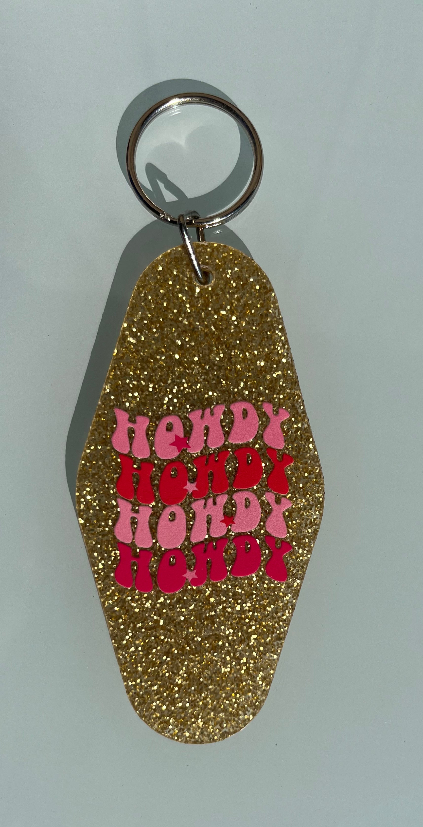 Motel keychains, with decals and silver or gold hardware.